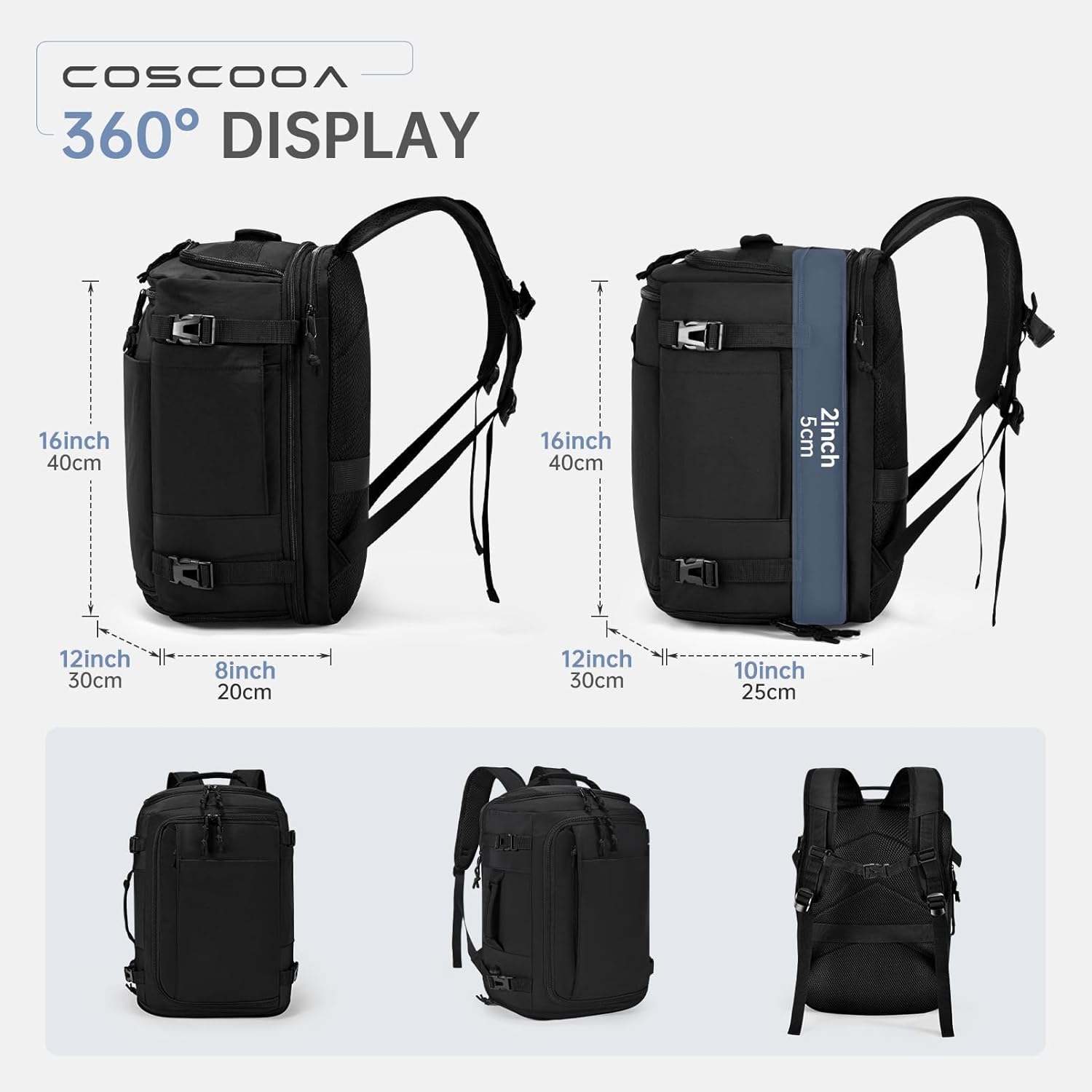 【Airline Approved Personal Item Travel Backpack】The dimensions of the COSCOOA travel backpack before expansion are 40x30x20cm/16x12x8inch,after expansion are 40x30x25cm/16x12x10inch,expansion 30L to 35L.As a personal iem bag, It is approved by most airlines including Ryanair, United Airlines and Frontier Airlines.