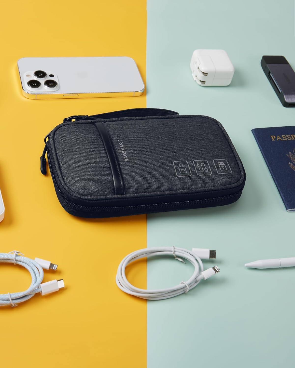 Considerate Design: The charger organizer travel case inner pocket storage space for cell phone, power bank, battery case, adapter, charger, USB cable, apple pencil, outer handy pocket storage space for passport/ticket/card/daily necessarily.