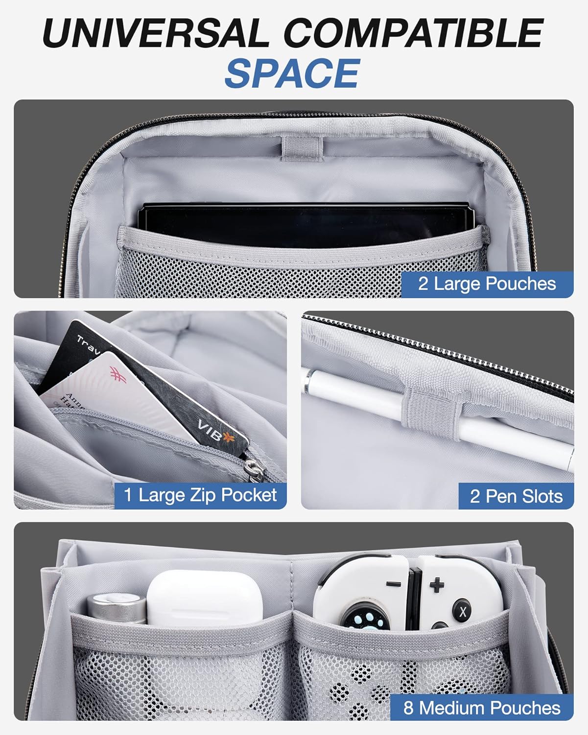 Compatible Space: The interior of this electronics organizer pouch in origami style, which allows you to open the bag 180° to take what you need, two large pockets for Nintendo Switch, power bank, hard disk and USB-C hub. Eight medium pouches are for your mouse, headset, watch, cords, chargers, 1 zipper pocket is for cards, tickets and travel essentials. 2 pen slots are for stylus pens