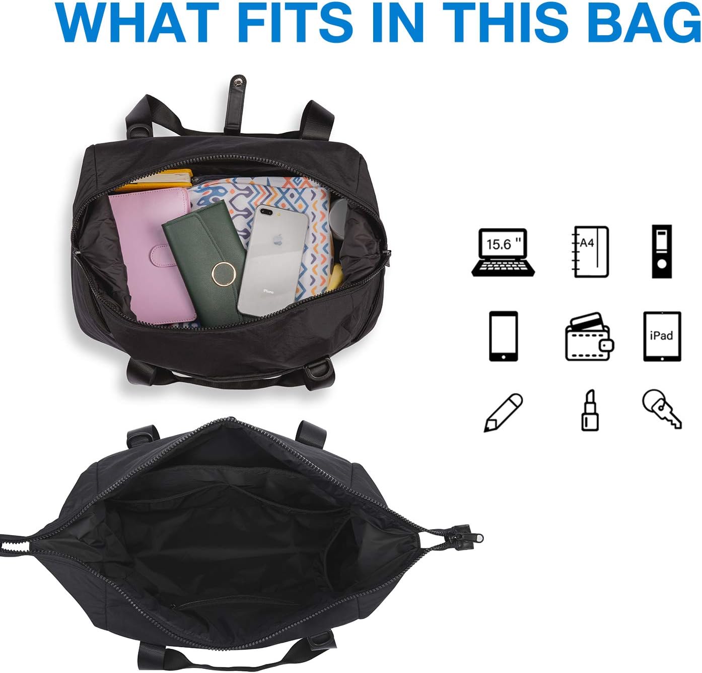 Compact Size- 18.5 x 8.7 x 11 inUltra Lightweight- Weekender bag weights only 1.8 pounds. Lightweight and soft nylon fabric makes your carrying comfortable.ch, meets most carry-on requirements.