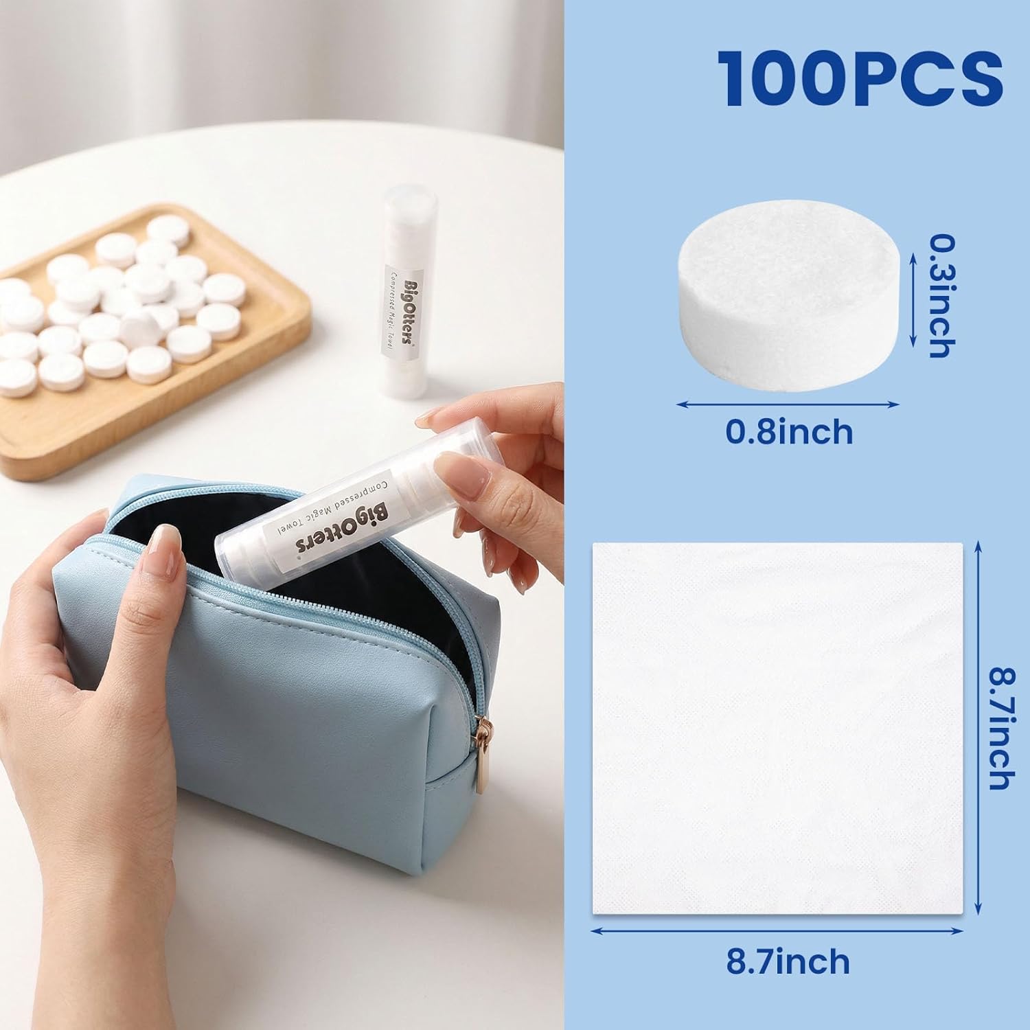 HYGIENIC AND PORTABLE DESIGN – There 2 durable storage tubes act as a protective shield, isolating the towels from external dust and moisture to keep them clean. They perfectly hold the coin-sized tablets for easy carrying. Once taken out, simply add water, and the tablet instantly expands into a 8.7″ x 8.7″ full-sized towel for immediate use. Note: Keep away from children