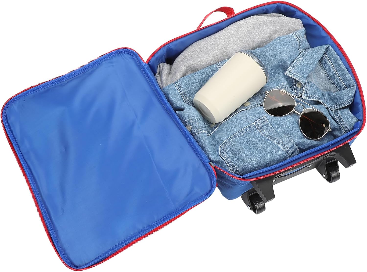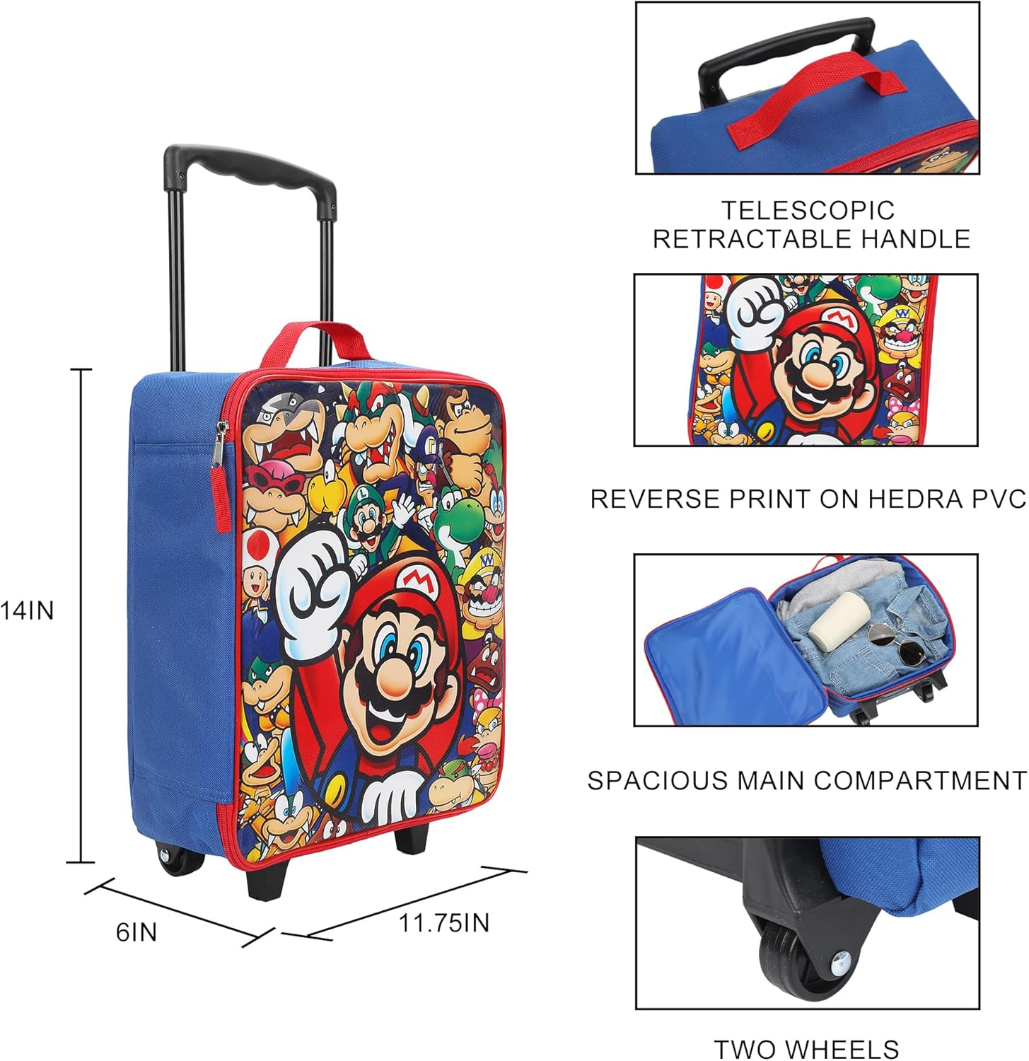 Level up travel days with this blue Super Mario Bros youth pilot case. Featuring Mario raising his fist in victory on a character-packed background, this bag brings video game excitement to every trip. The telescopic retractable handle and two wheels offer smooth rolling, while the interior mesh pocket adds smart storage. Crafted from sublimated 600D poly, it’s built to last. Wipe it clean to keep it ready for game day.
