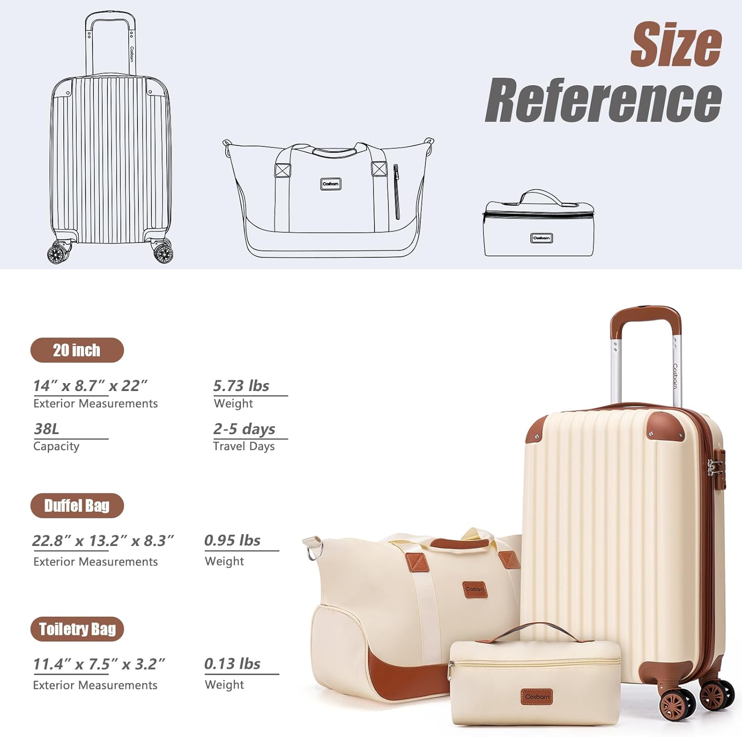 【Airline Approved Suitcase】Carry on luggage 22x14x8.7 airline approved is suitable for work travel, vacations, or business trips. Overall Dimensions: 22″x14″x8.7″(including wheels), Capacity: 38 L. The Cosbarn carry-on suitcase claimed a free 3-year warranty. If there is any issue please feel free to let us know.