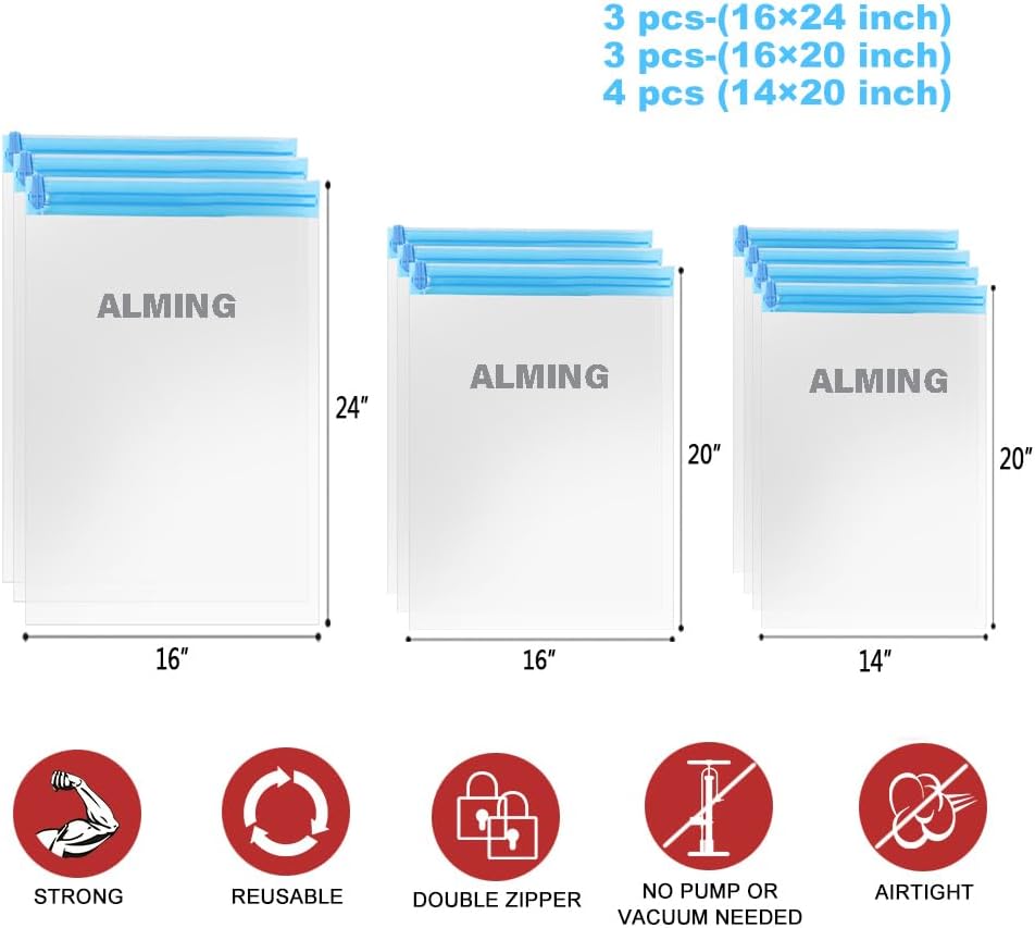 Are you still carrying heavy luggage for the trip? Our ALMING compression bags for travel set is the preferred solution for all the storage troubles when you travel, move or change seasonal clothing in your closet. Our travel space saver bags can save up to 75% of the space for extra clothes, blankets, pillows and towels.