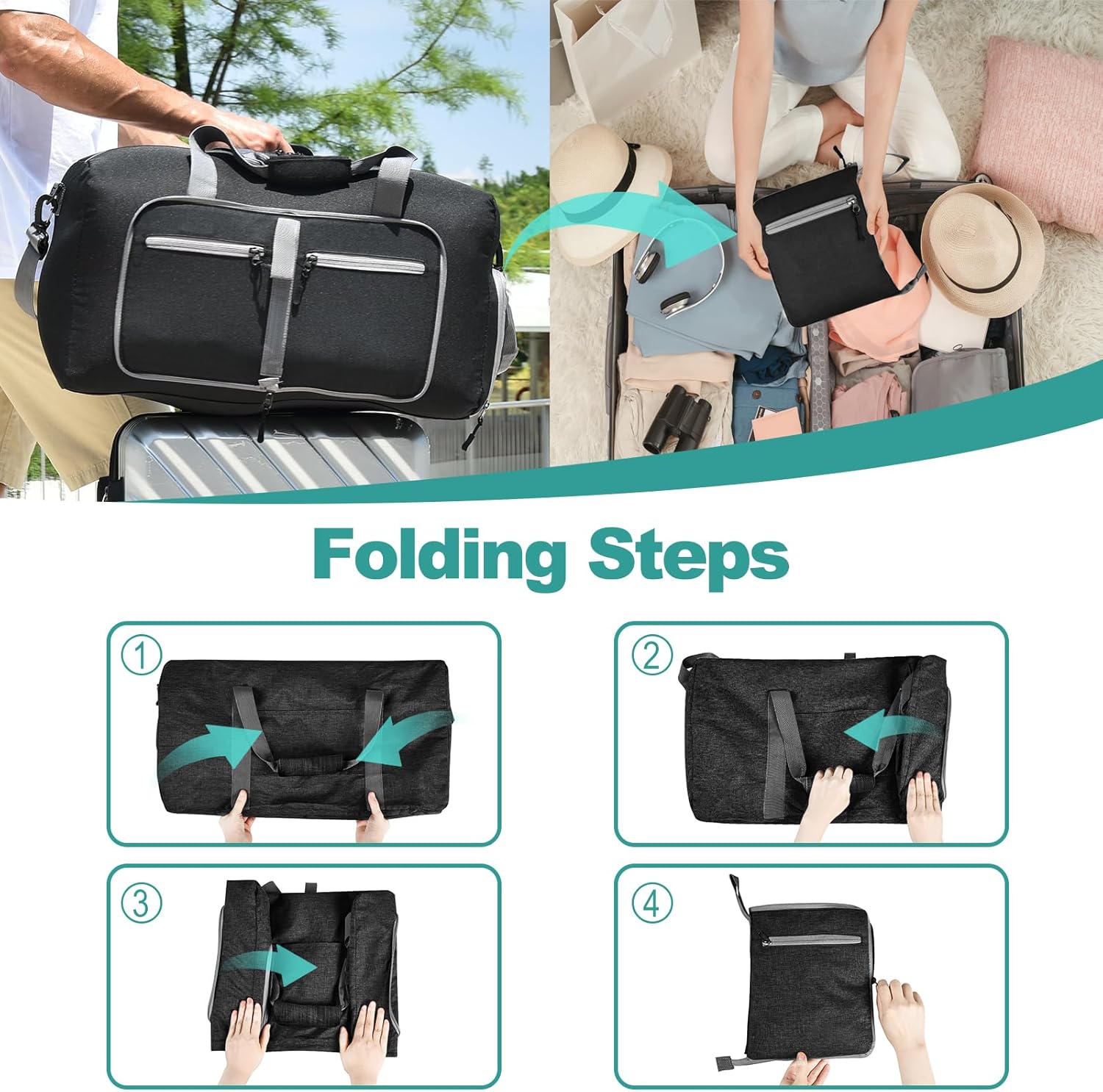 Foldable and Spacious travel bag: The foldable duffle bag for travel can be folded into a really small size taking up so little space but opens up to have about 40L capacity of travel duffel bags to use as the luggage bag in case that your suitcase swells, this travel bag works very well when used in combination with a luggage, it’s to give you an organized lightweight travel experience