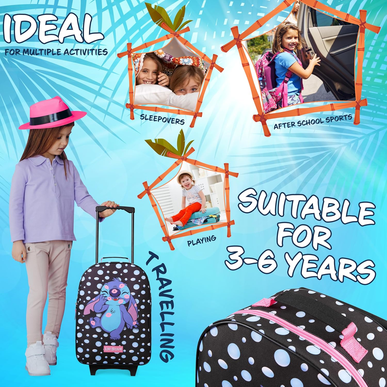 With two sturdy wheels, this kids rolling suitcase is easy to maneuver, ensuring your child can easily pull it along. Its compact design allows it to fit in overhead compartments or car trunks.
