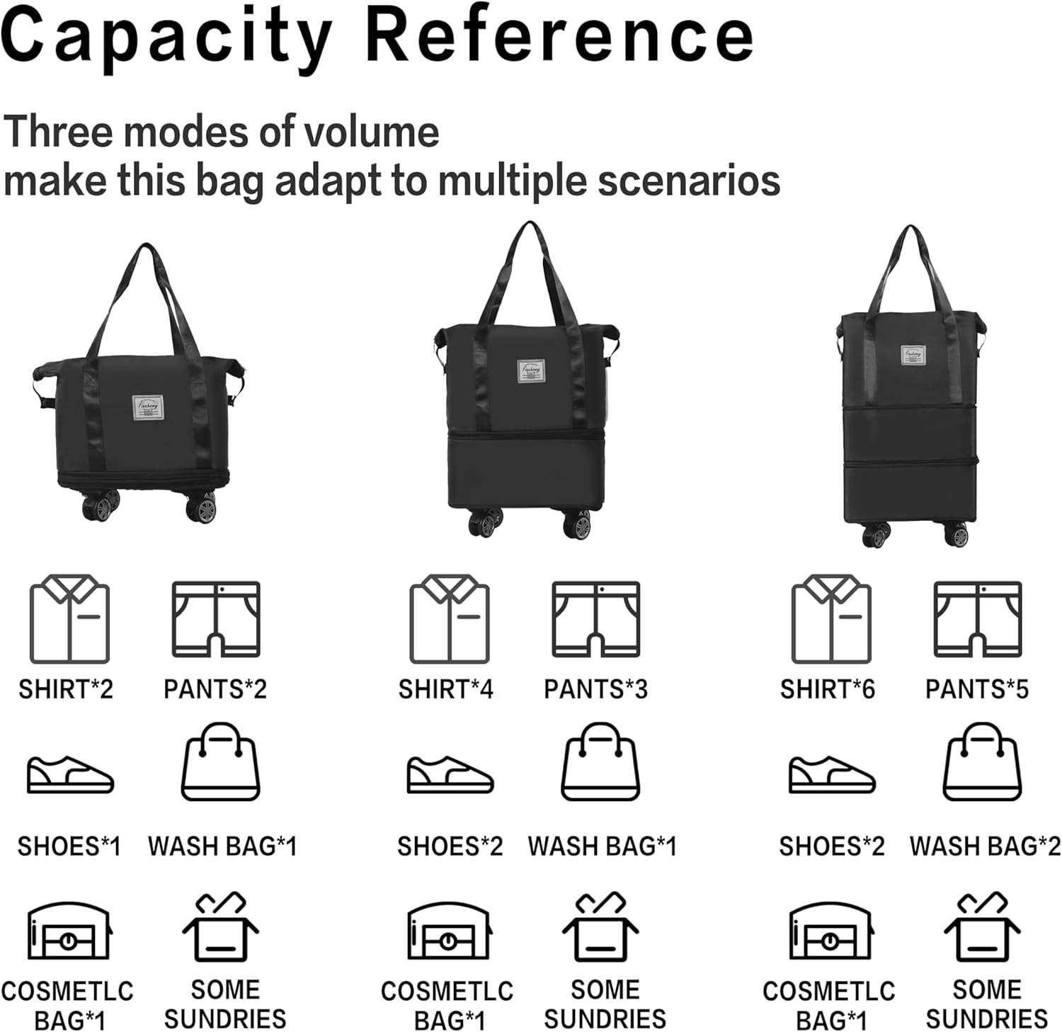 1. Special Structure with Expandable Design – The capacity of the travel bag can be expanded from 28L to 43L and then to 58L. When you use it for small stoarge of 28L, please close the 2 zippers on the bag. If you need it to hold more staffs, you can open the side zippers to make it to 2 layer high of 43L and 3 layer high of 58L. After enlarge the bag, you can install the wheels for easy-moving. Please check our pictures for detailed illustration for adjustments. If you’re confused with the expansion, just feel free to contact us for help.