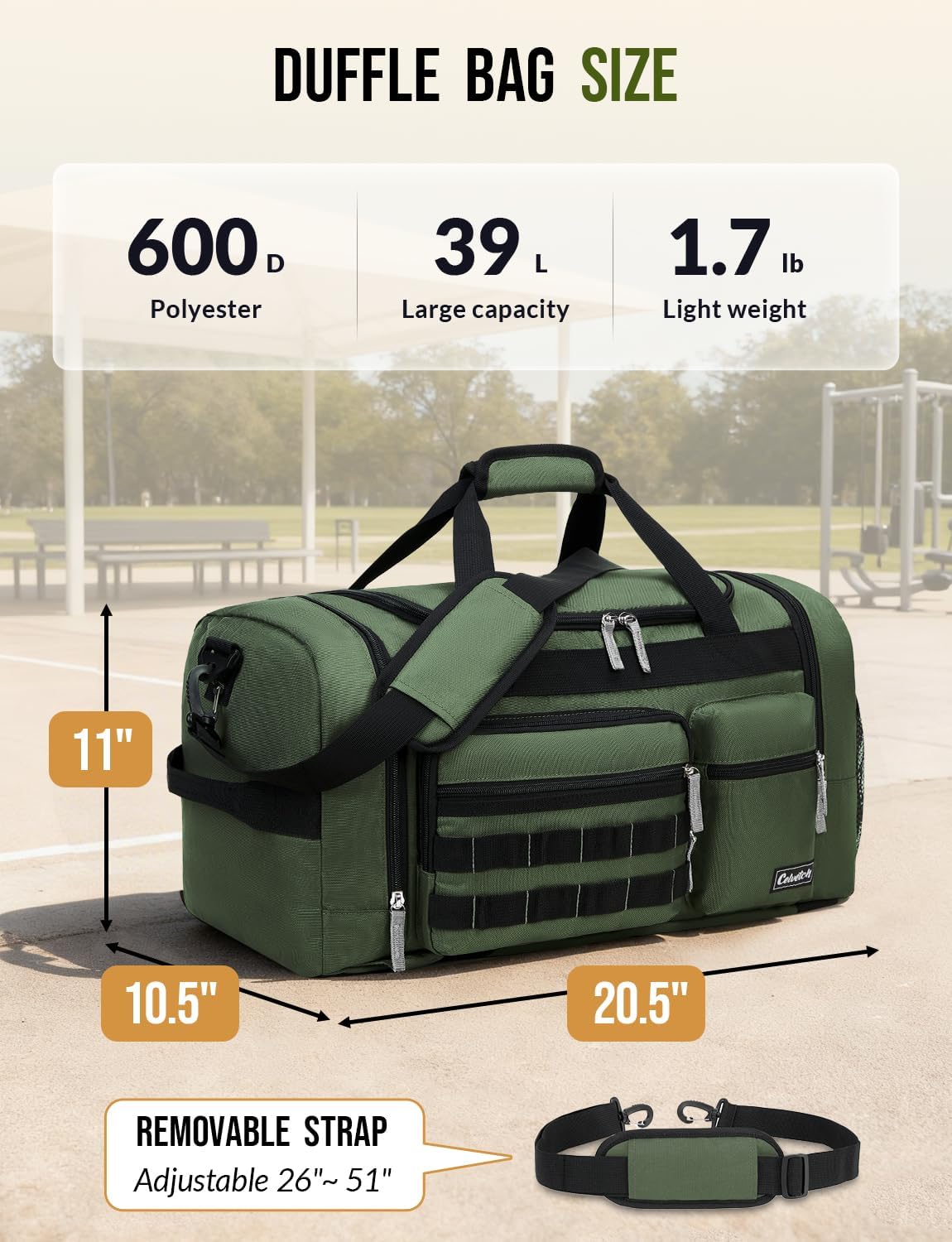 Large capacity tactical bag: The gym bags for men measuring 20.5″L x 10.5″W x 11″H with a 39L capacity. The gym backpack is made of water-resistant and tear-resistant 600D polyester, suitable for various outdoor environments. Boasting sturdy metal SBS zippers and reinforced stress points for longevity. The luggage strap can be slid over the suitcase handle