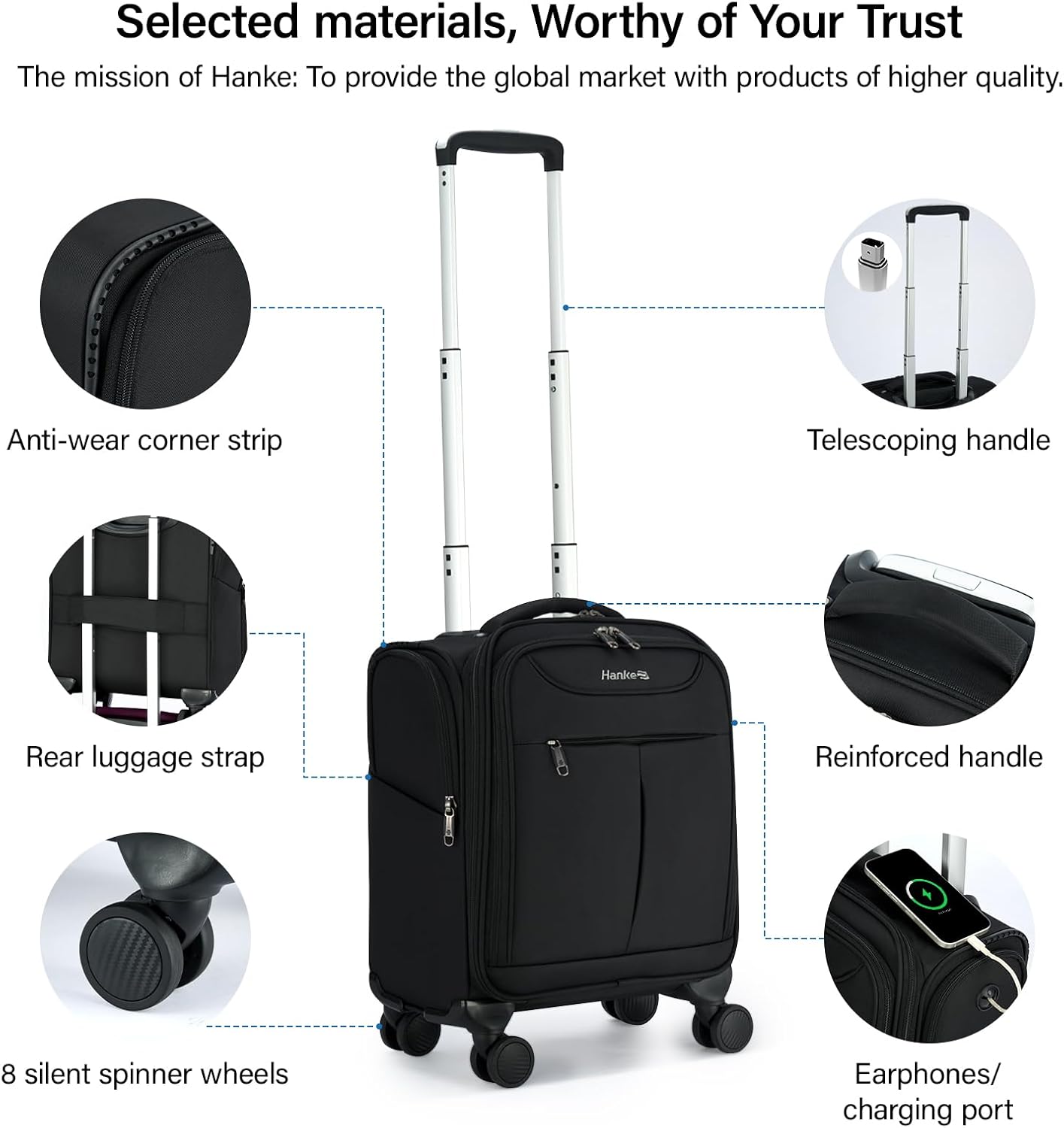 ·Welcome to the Hanke-International leading travel luggage brand. Since 2001, Hanke has been committed to delivering a superior ownership experience to its customers. ·Hanke has its own production base, R&D center, production workshop, professional testing center, warehouse and other related supporting centers.