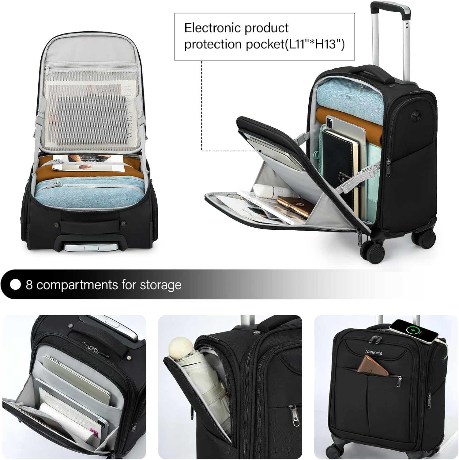 【LIGHTWEIGHT & MAXIMUM CAPACITY】Under seat bags for airplanes,Softside carry on luggage weighs only 5.6lbs yet with 8 compartments for storage,convenient front pocket and two side pockets for easy access,everything has its place, making it a breeze to find what you need and holds 3-5 outfits in main compartment.