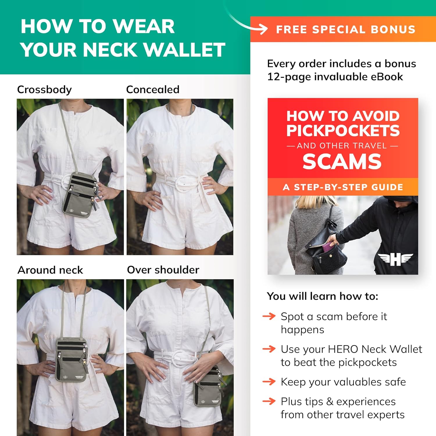 That’s why we custom designed the HERO Neck Wallet, an all-purpose passport holder for both men and women that stores credit cards, currency, tickets, and more; and protects them all from theft with discrete, hidden comfort and RFID blocking technology. It allows you to carry everything close to your chest and pull it out when you need to pay, or show a passport, all without digging into a backpack and showing pickpockets where your valuables are located.