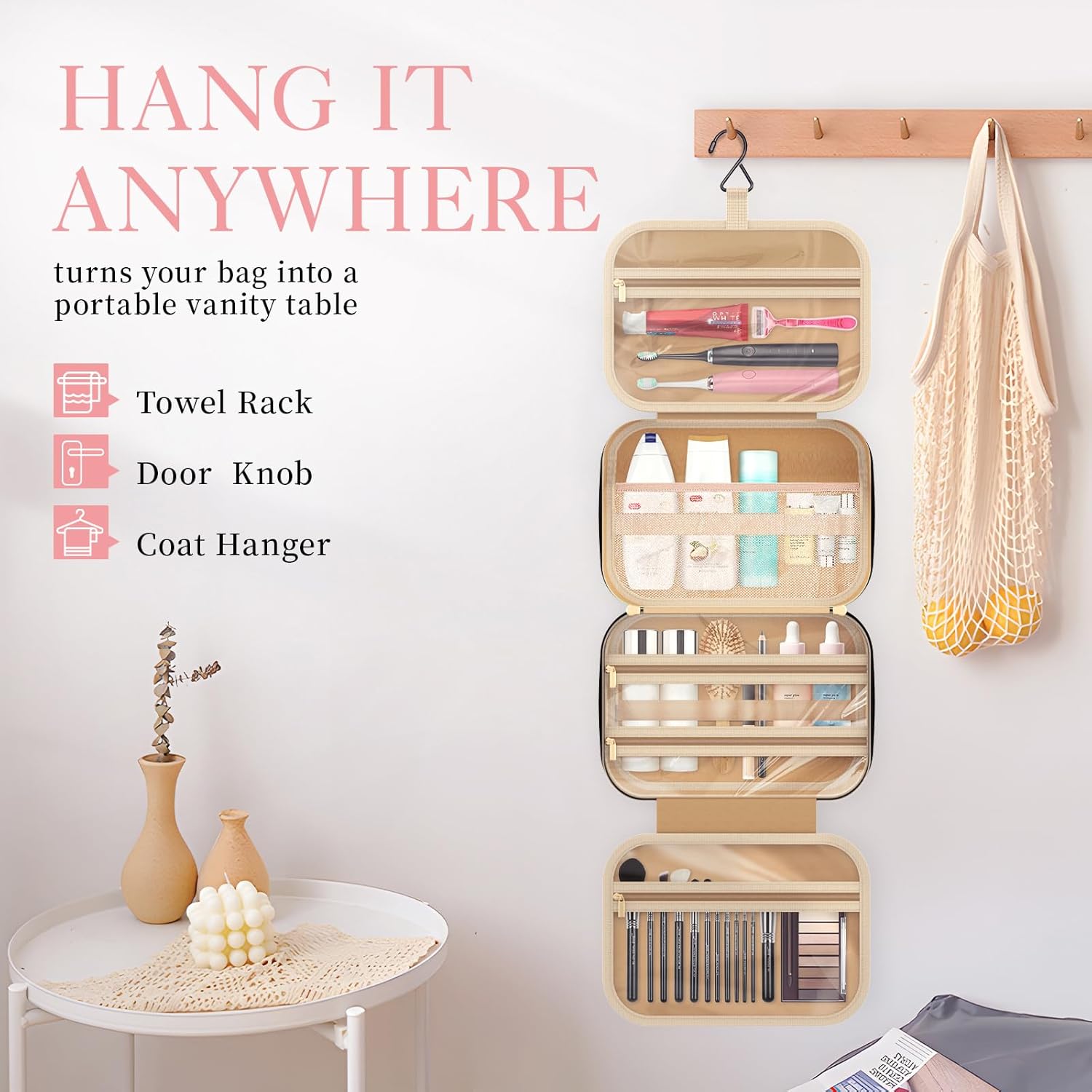 STURDY HOOK DESIGN: Featuring a premium metal hook, the HOTOR cosmetic travel bag offers the convenience of hanging from a towel rack, coat hook, or any available space. This not only showcases your toiletries and cosmetics for easy accessibility but also saves valuable bathroom counter space. The sturdy metal hook is designed with a retractable feature, allowing it to be neatly stowed away when not in use.
