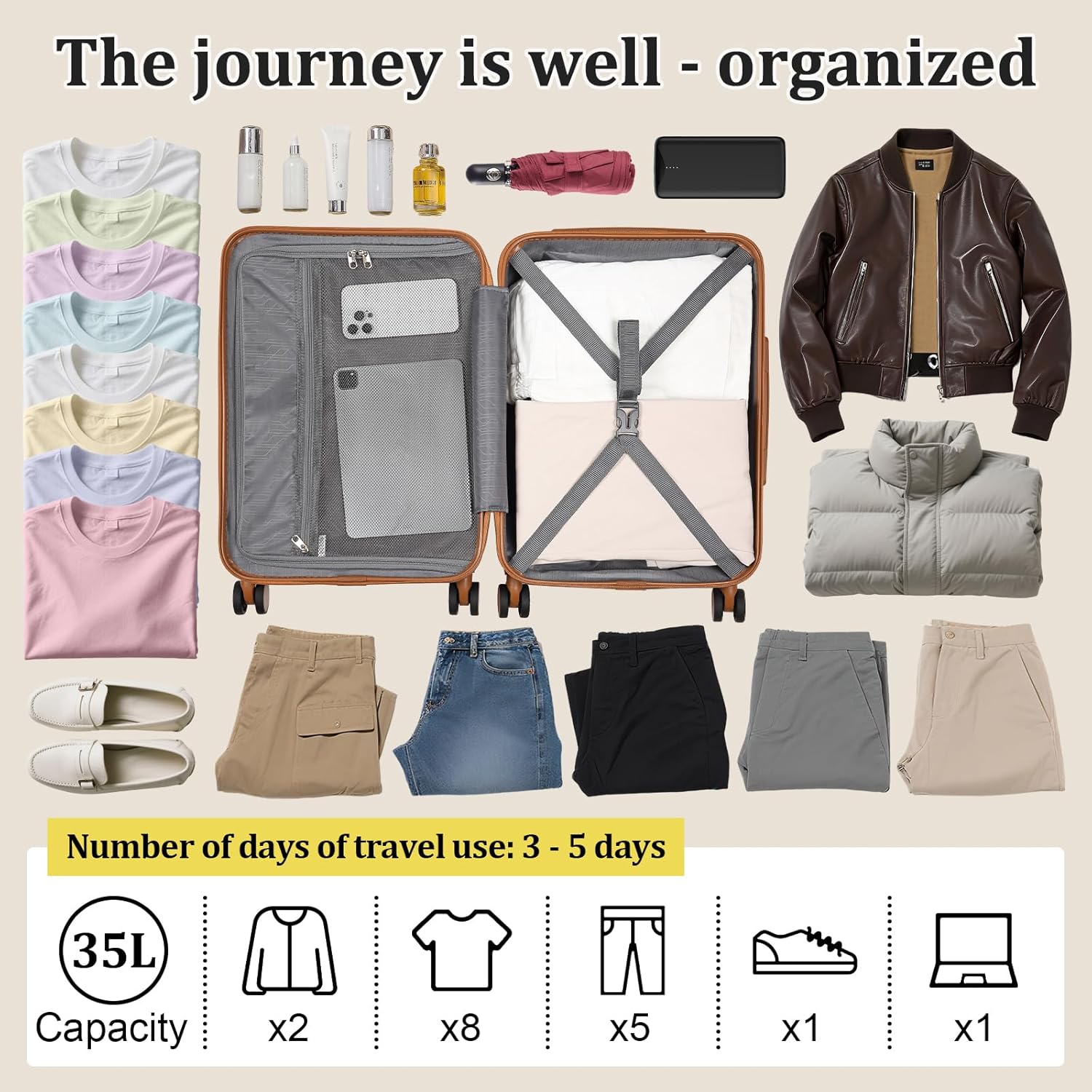 Interior Space: The hard shell carry on suitcase has zippered compartments, cross straps, and mesh pockets inside, making it easy to organize items. The carry on luggage has a large space, and the travel backpack has numerous pockets, meeting various travel needs