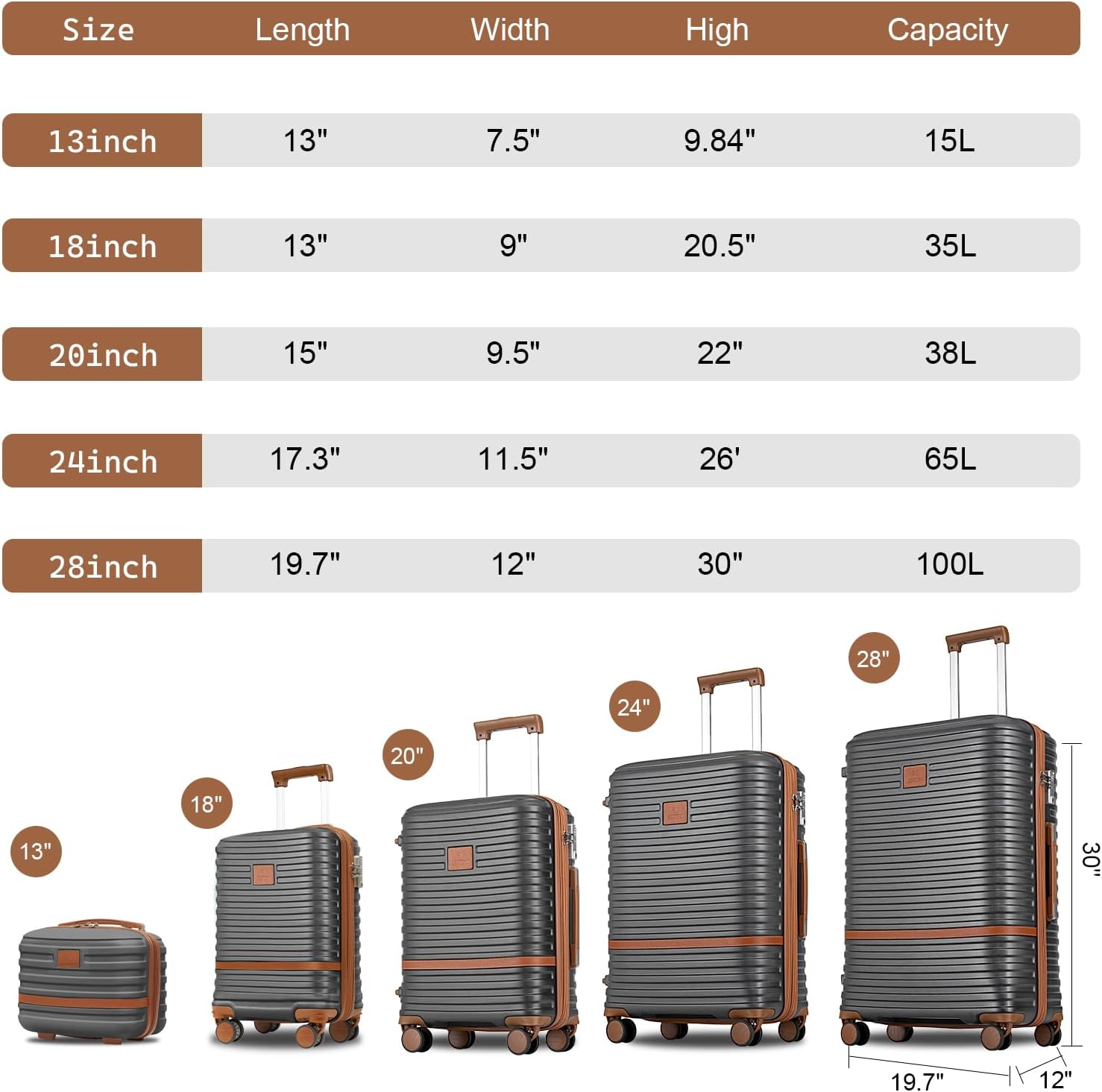 18inch and 20 inch suitcase can be boarded, 24 and 28 inch laggage can only be checked. The 18″ suitcase weighs 5LB, The 20 inch suitcase weighs 6LB, 24 inch luggage weighs 7.5LB, and the 28 inch Luggage weighs 8.5LB.