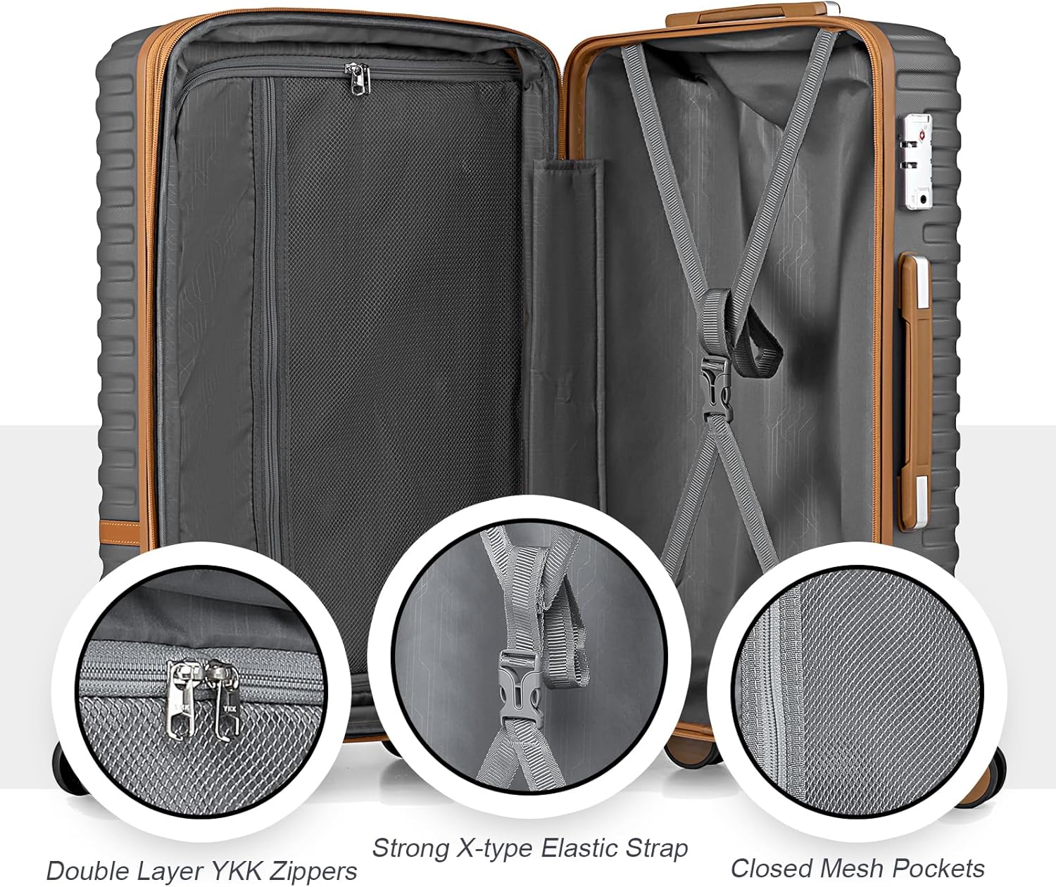 Portable luggage Organizer: The interior of the luggage uses zipper dividers and cross-organizer pockets to effectively prevent loose and messy items. Equipped with double-layered YKK zippers with strong anti-explosion performance.