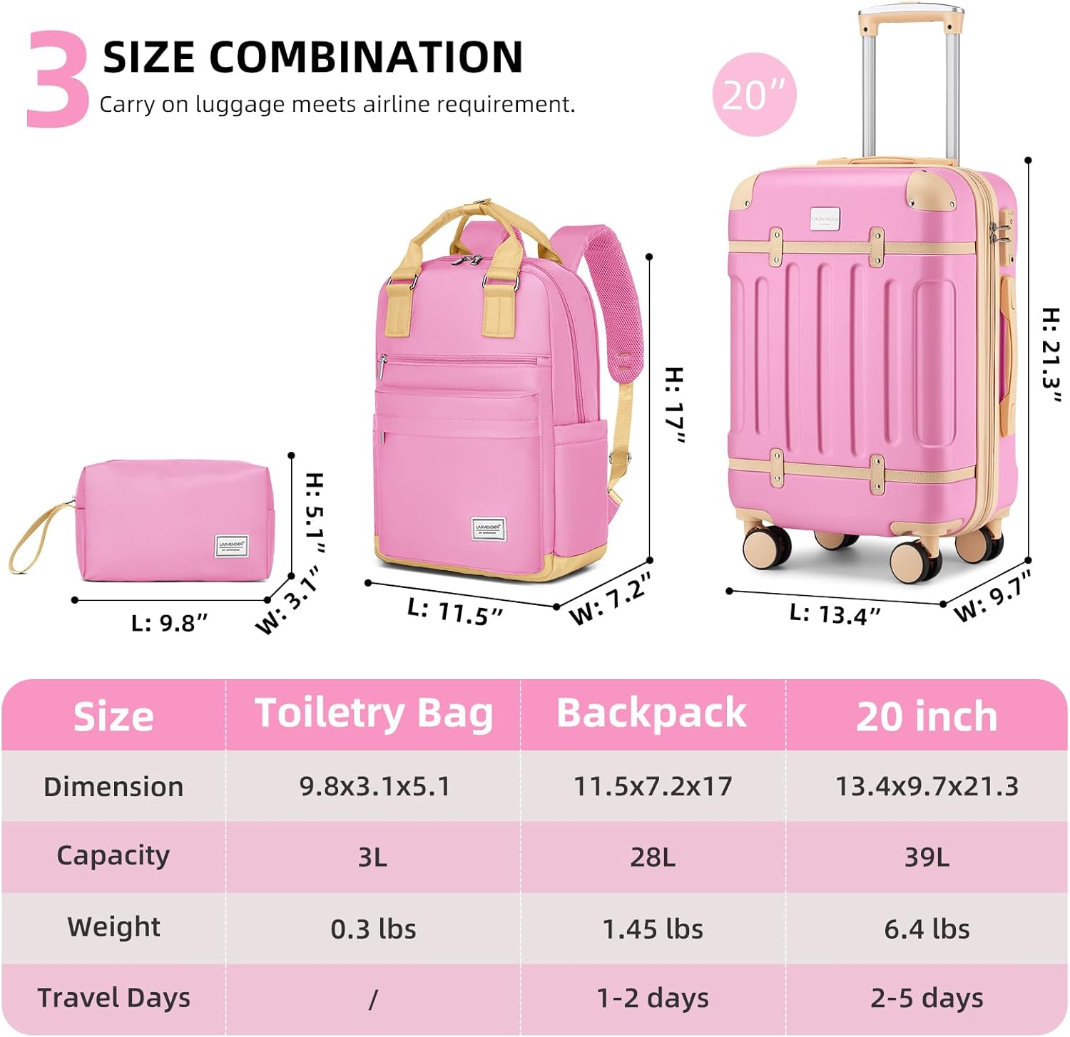 Expandable Carry on Luggage with Backpack: 3-piece set includes 20inch expandable carry on luggage 22x14x9 airline approved (Expands for extra 25% packing capacity), a travel backpack and a toiletry bag. The suitcase meets most American International Airlines’ carry-on luggage size requirements