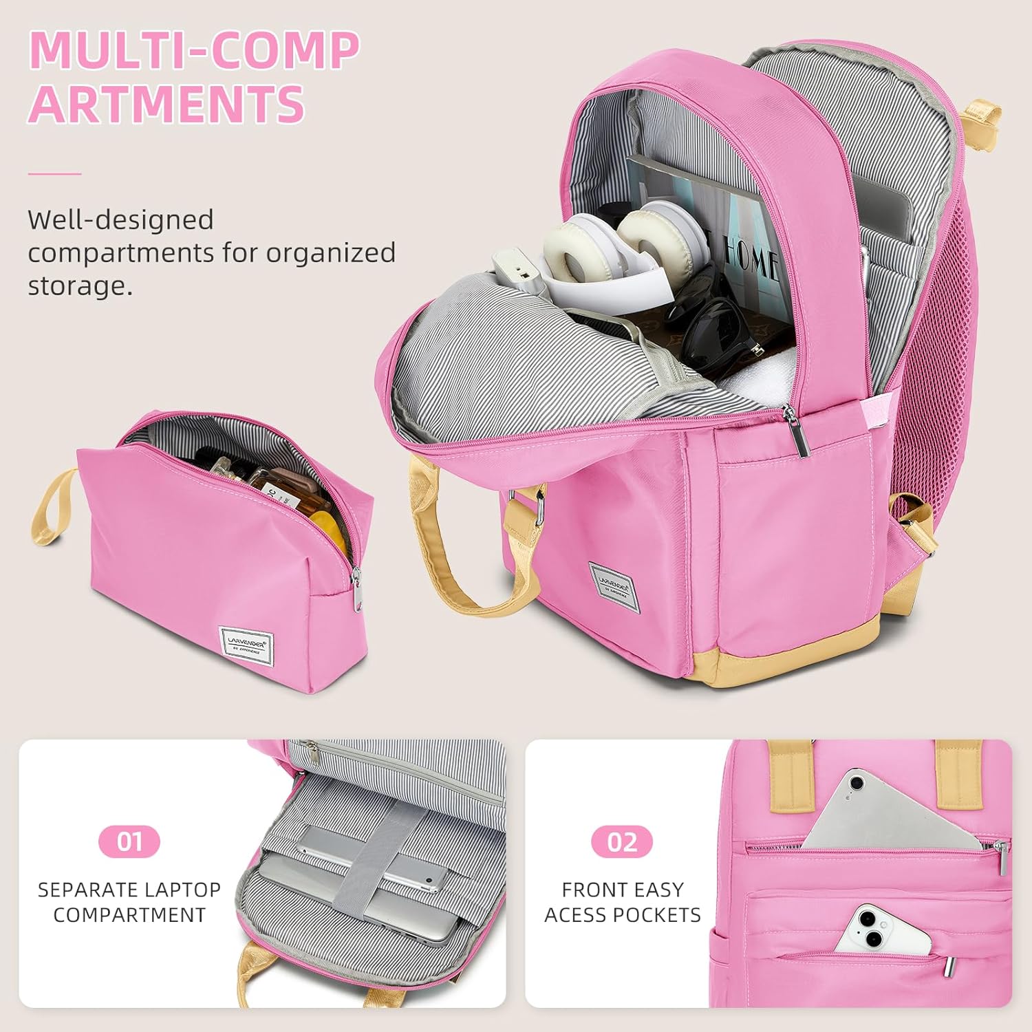 This travel backpack and small makeup bag deliver roomy main compartment to store your clothes and items.