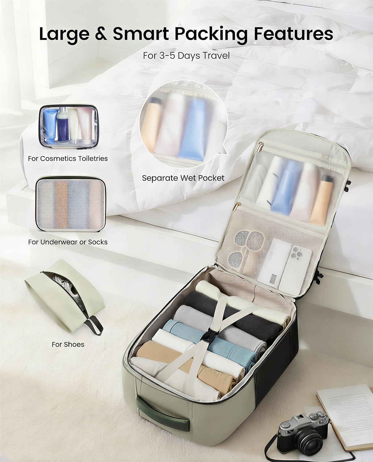 ✈【With 3 Packing Cubes and wet pockets】This waterproof travel backpack for women includes 3 bonus packing cubes (2 storage bags + 1 shoe bag) to neatly organize underwear, socks, and small items. The 42cm shoe bag fits 1–2 pairs of shoes. A leak-proof, water-resistant wet compartment keeps toiletries and damp clothes separate, so everything else stays dry and clean.