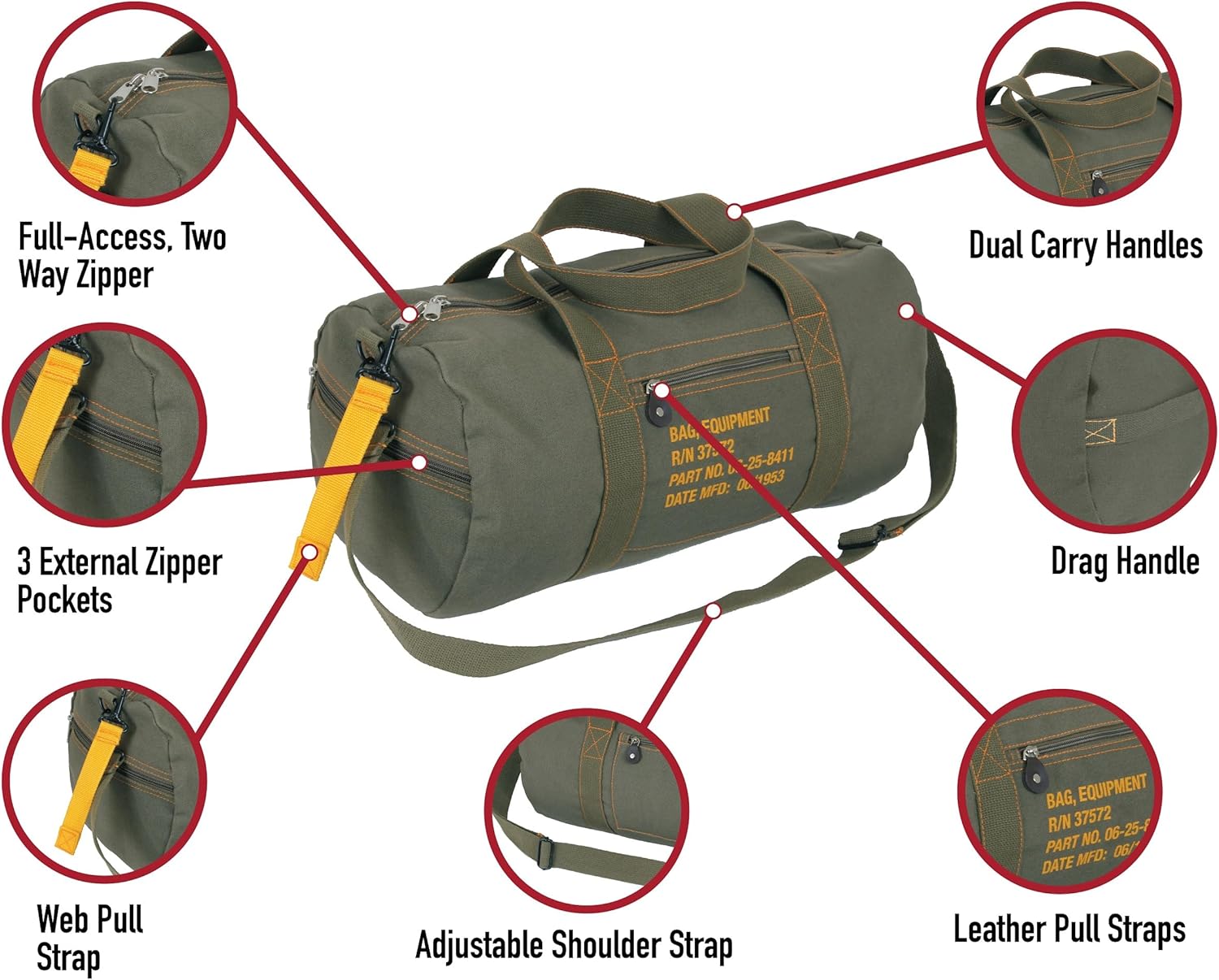 CONVENIENT STORAGE: Our Canvas Equipment Duffle Bags are perfect for storing clothes, small sports gear, spare tools, travel items, and more. The bag measures 19” x 9.5” (dia) overall. Whether you’re going to the gym, traveling for the weekend, or exploring the wilderness, keep your gear and equipment alongside you.