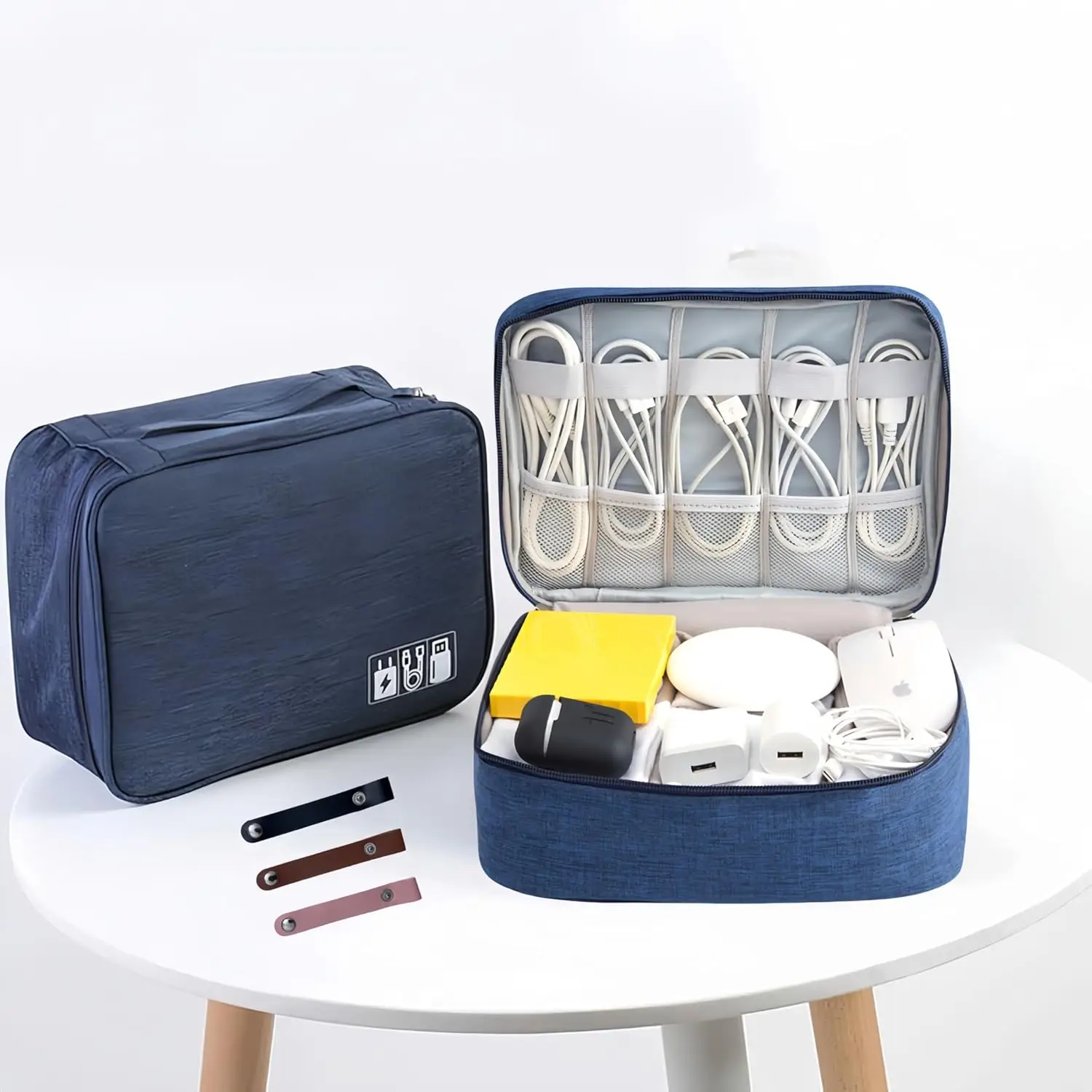 🔹 CONVENIENT LEATHER STRAPS – 3 leather straps with buckles to securely hold all types of cables and prevent tangling