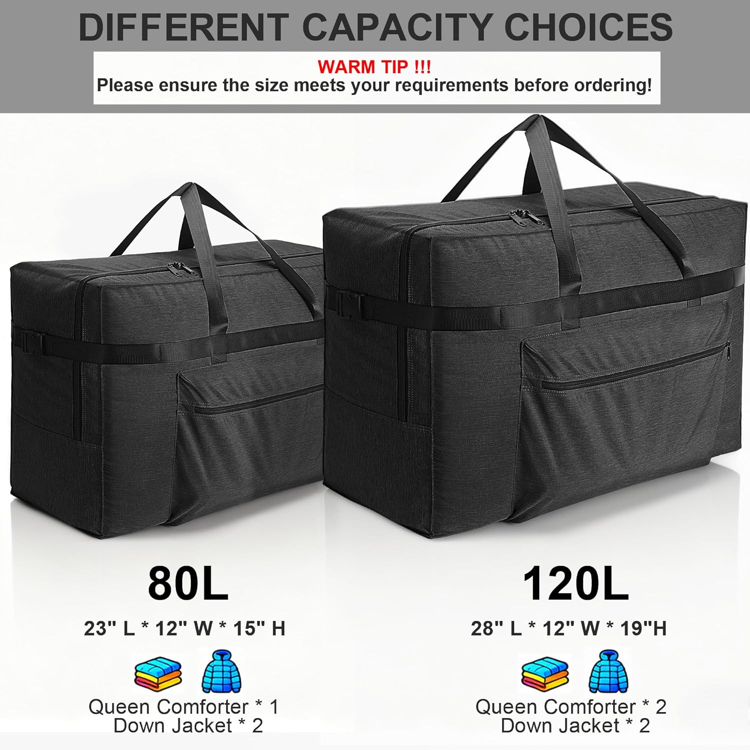 120L Extra-Large Capacity: Boasting a spacious 120L interior (29″ x 12″ x 20″), this duffle bag is designed for long journeys. It effortlessly stores all your travel essentials and securely transports bulky gear; IMPORTANT: Please pay close attention to the SIZE and CAPACITY according to your requirement before ordering