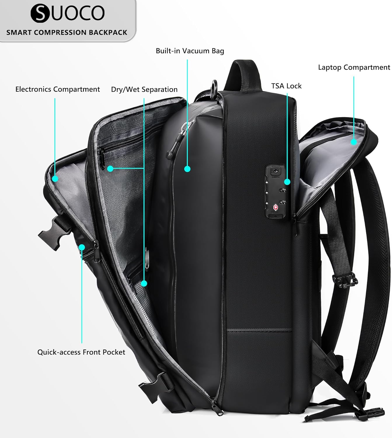 Vacuum Backpack for Travel: The SUOCO Backpack features a built-in vacuum-compression bag that allows you to pack up to 45 liters of clothing—far more than a 20-inch carry-on can hold. This breakthrough in travel convenience and storage efficiency lets you fit maximum capacity into a compact form, so you never have to compromise on what to bring. A wireless electric travel pump is included to compress everything in just 10 seconds.