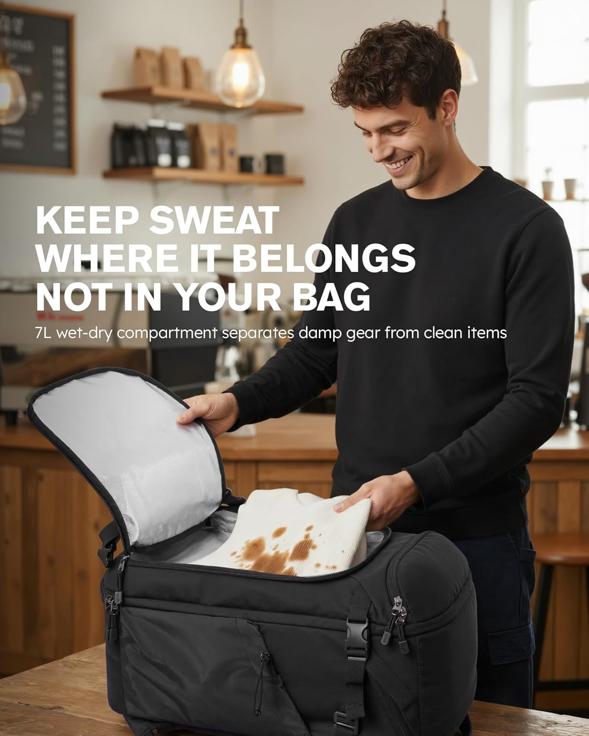 【7L Wet-Dry Compartment & Large Water Bottle Holder】Stay fresh and organized. A 7L front wet-dry compartment lined with eco-friendly aluminum film keeps sweaty or used clothes, towels, or swimwear separate. The large side pocket fits bottles up to 40oz (base under 4″) and secures with an elastic cord. This travel laptop backpack keeps gym, hiking, or outdoor essentials organized and accessible