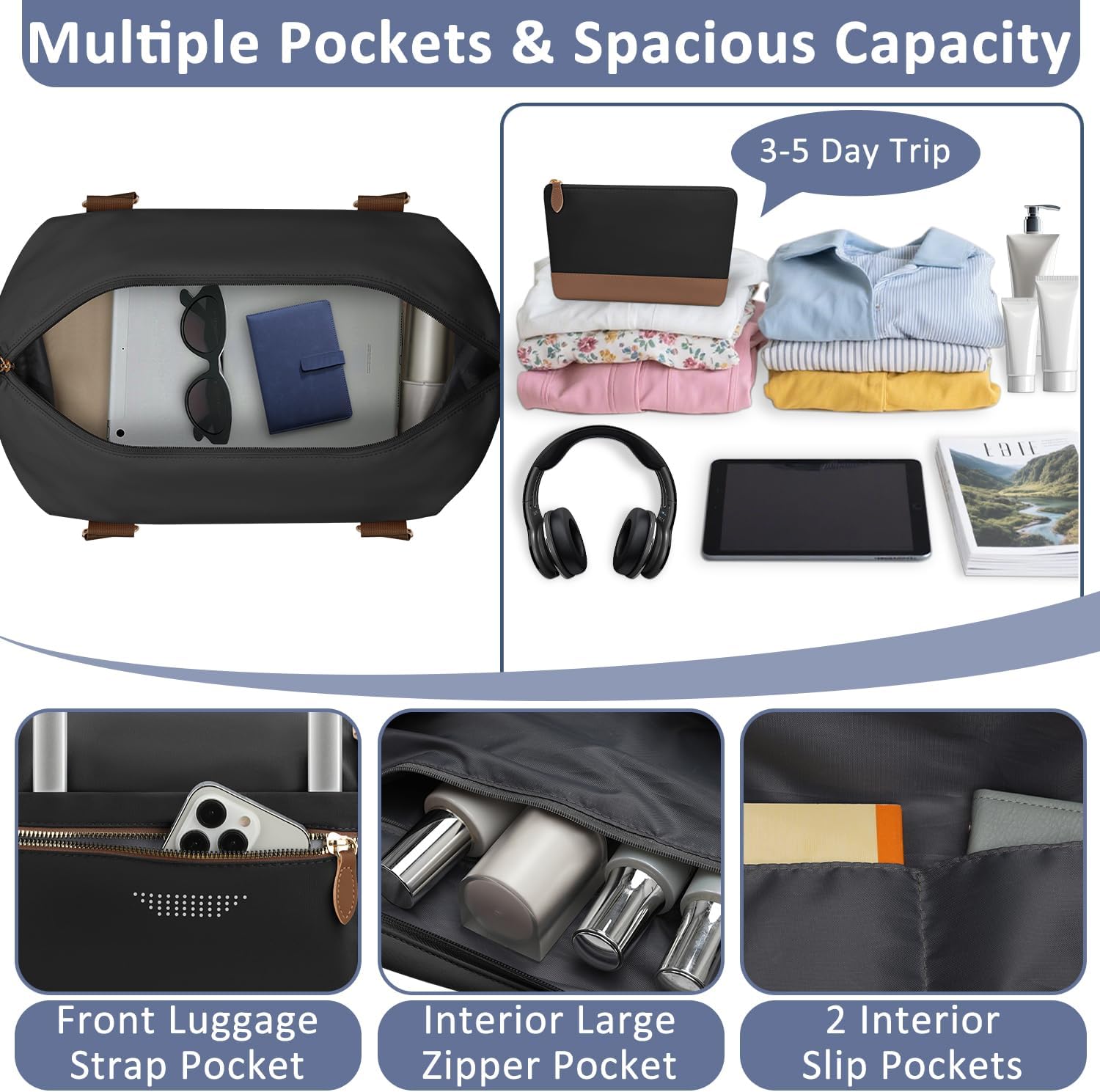 Premium Upgraded Fabric & Free Toiletry Bag: These travel duffel bags are made of tear-resistant and water-resistant polyester Oxford material, featuring heavy-duty stitching and reinforced straps. Designed for long-term use, they have held up perfectly through multiple trips. This womens duffle bag comes with a free toiletry bag, perfect for storing cosmetics or small travel essentials, easy to help keep things better organized.
