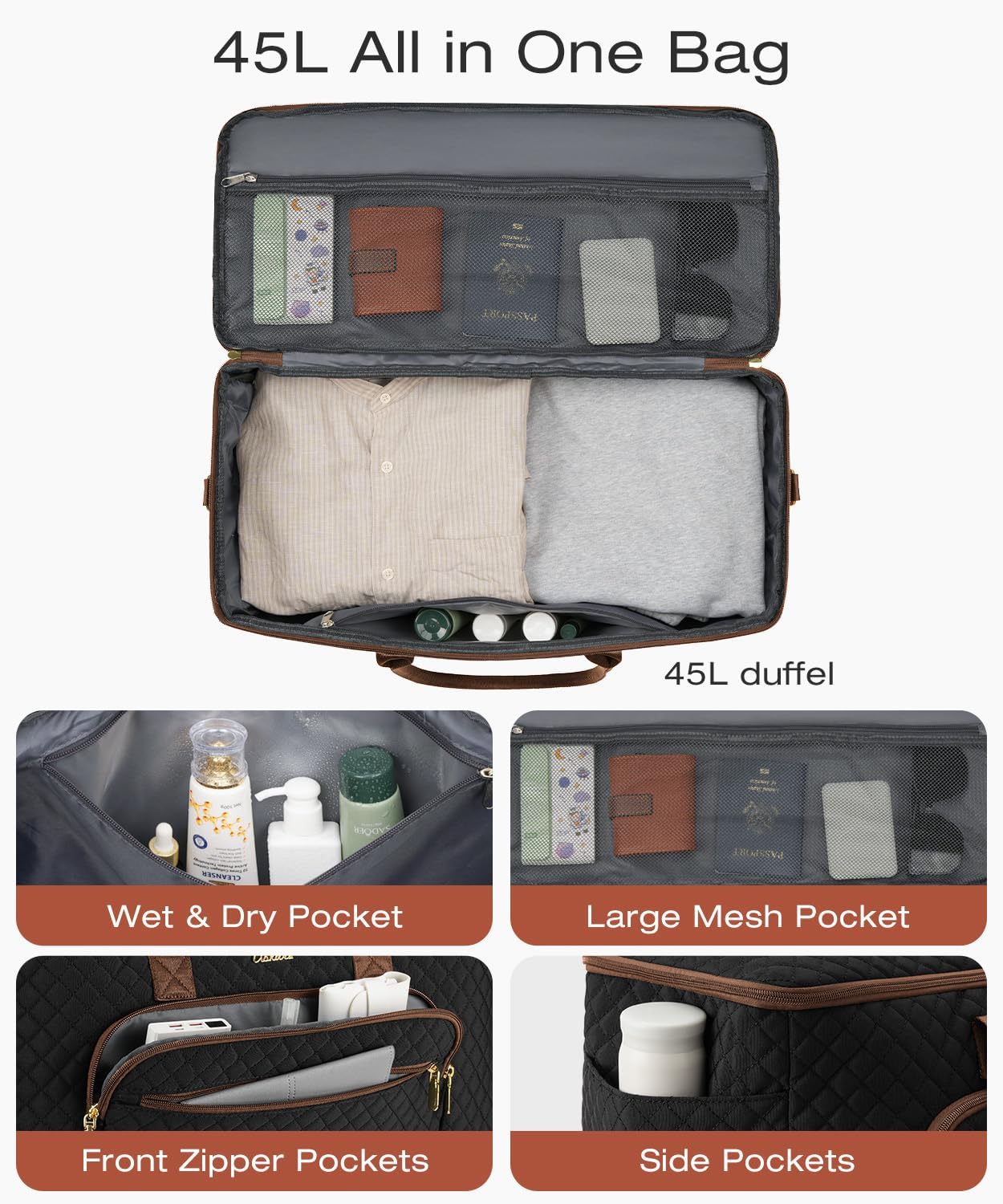 Organized and Accessible: Say goodbye to the chaos of unorganized travel duffel bags. Our overnight bag features a large main compartment with a visual mesh bag, a wet/dry separation pocket that keeps toiletries and damp towels organized. Also the duffle bag for travel has an organized compartment on the front panel for your other essentials. 2 side pockets for water bottle, all crafted to make packing and access effortless.