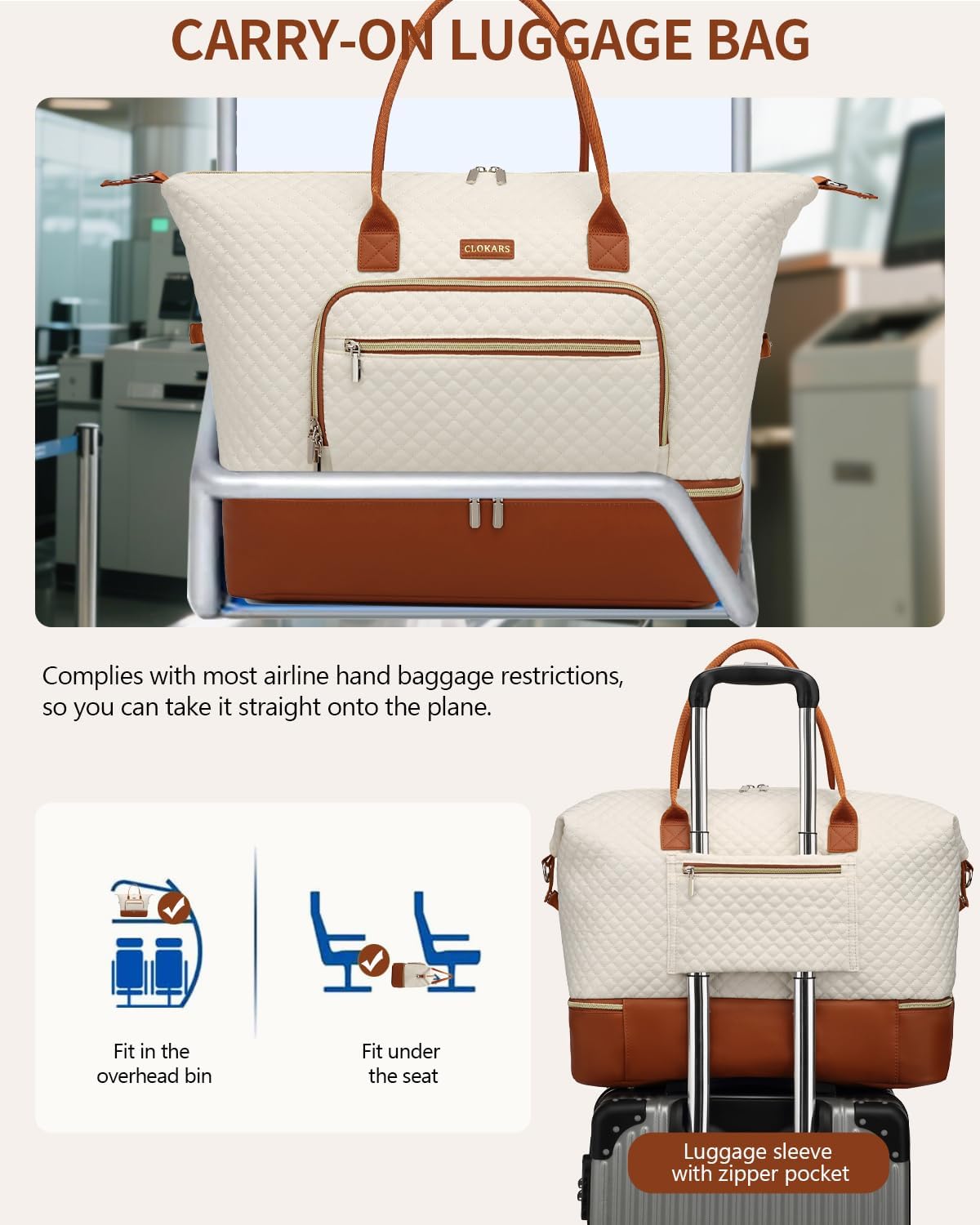 Carry On Bags for Airplanes: The weekender travel bag measures 13.5 inches high, 19.5 inches wide & 8.66 inches deep – Travel-friendly design meets check-in suitcase requirements. Fits in the overhead compartment as well as the under seat as Personal Items in flight. Avoid hassles & extra fees at the airport.