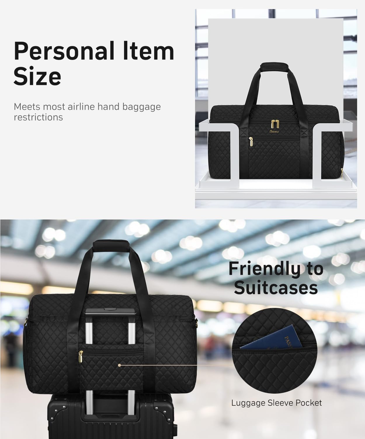 Generous 40L Capacity: Perfect for 3-5 day trips, our large duffle bag for travel measures 20.5″(L) x 9.5″(W) x 10.8″(H). Designed to meet airline carry-on standards, it fits effortlessly in overhead compartments or under the seat. The transparent toiletry bag(9.8″ x 2.8″ x 6.7″) that holds 5-10 travel-sized cosmetics is efficient for security checks.