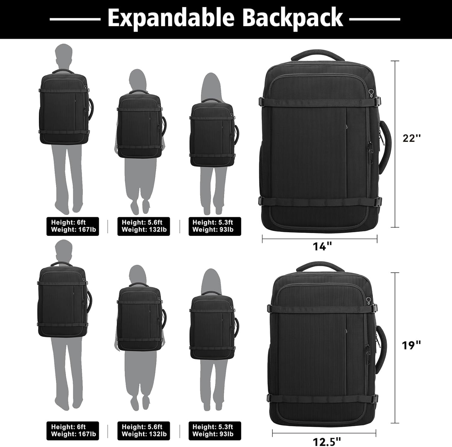 1️⃣ Expandable 40–50L Carry On Space:Compact 19 x 12.5 x 5.5 inches size for everyday carry and travel then expands to 19 x 12.5 x 8.5 inches to deliver 40–50L capacity for 3–5 day trips weekend travel and flights padded sleeve fits a 17.3 inch slim laptop,14inch pad, plus organizer pockets for clothes shoes tech accessories and chargers lightweight 2.4 lb travel backpack for easier airport travel and daily commuting