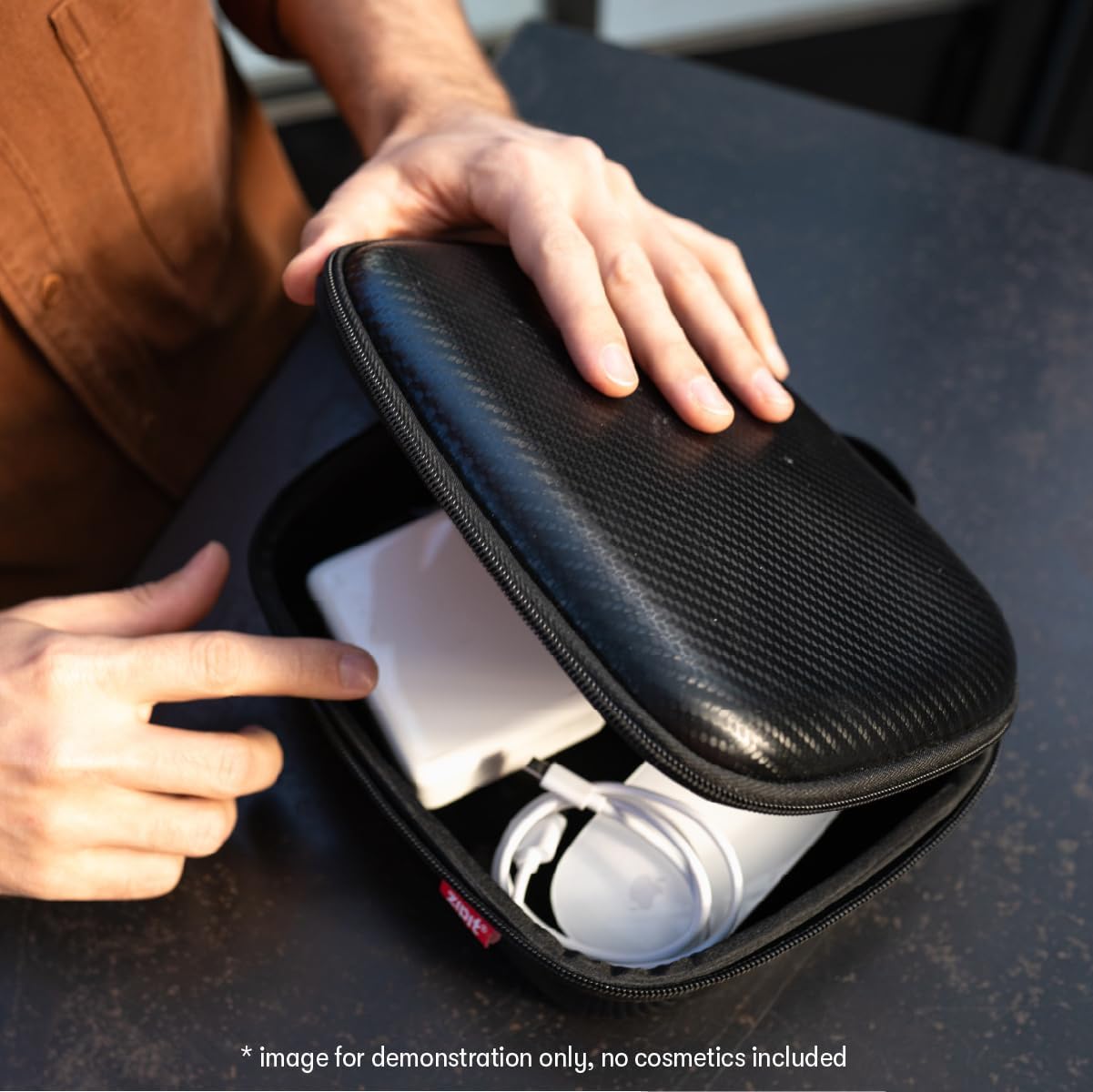 PROTECTIVE EVA HARD SHELL – Structured EVA case with a carbon-style finish helps protect cables, chargers, and electronics from pressure and everyday travel wear.